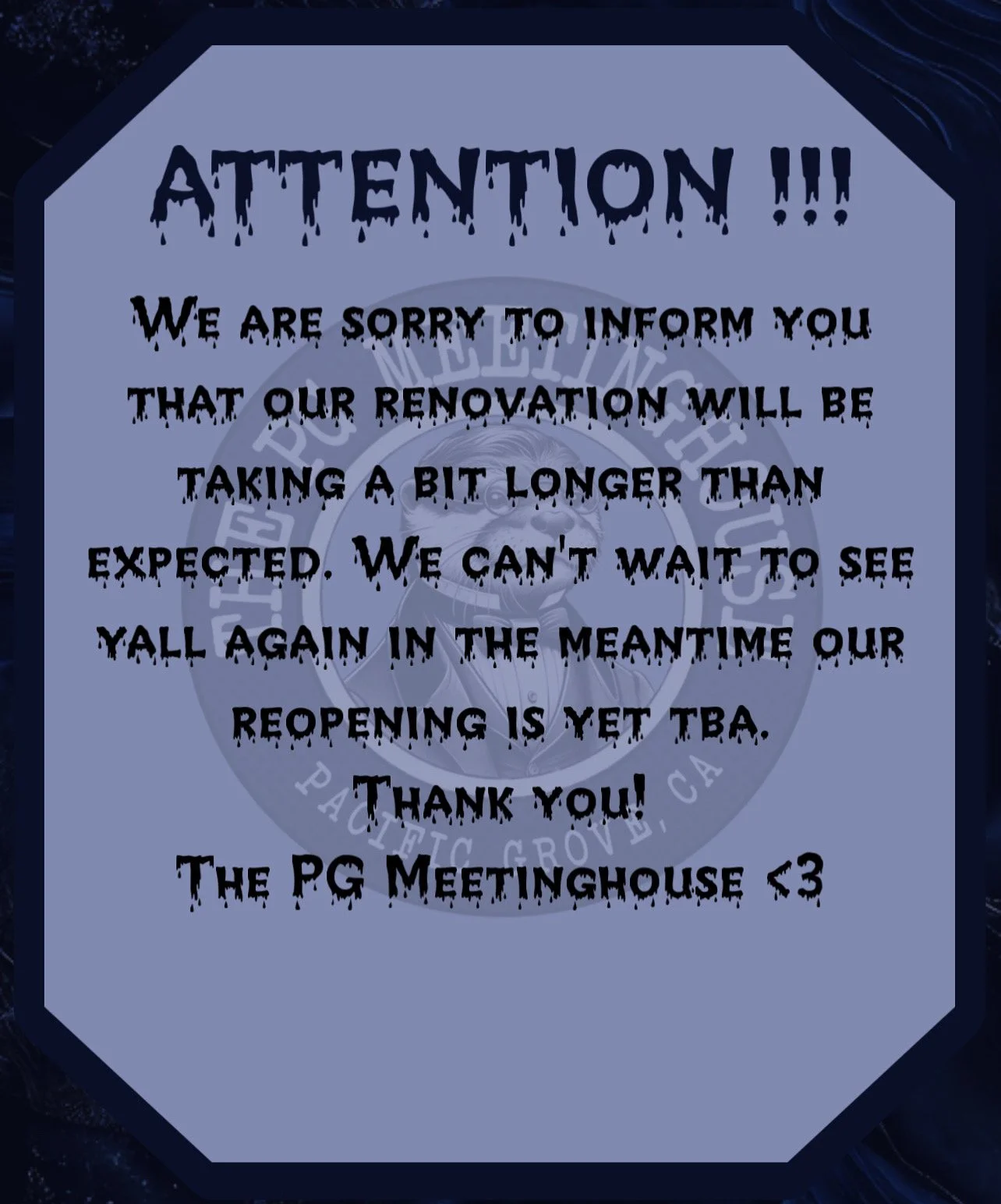 Our motto for The PG Meetinghouse – we are committed to our current customers, community, and vibe. We’d love for you to come enjoy our space, get something to eat and drink, and be part of our community – Welcome!